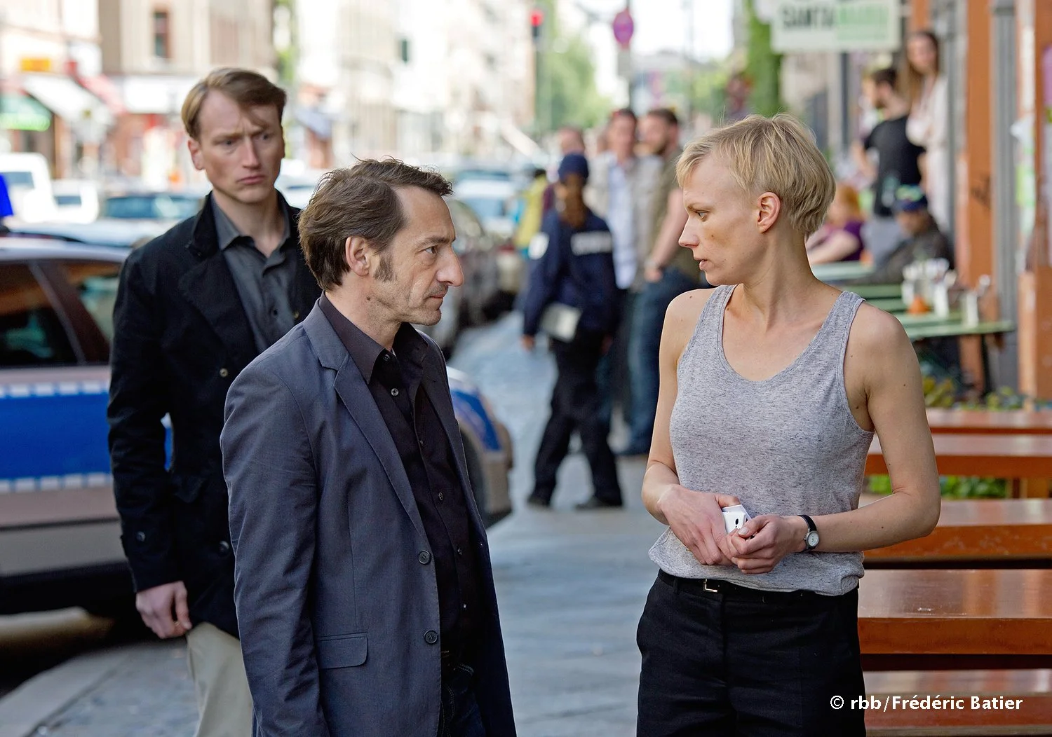 From Tatort Vielleicht with Boris Aljinovic, Christian Sengevald and Lise Risom OlsenCopyright: rbb / Frédéric Batier.